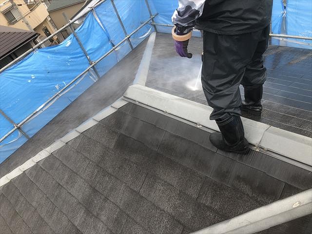 外壁塗装も同時で行いますので屋根から下へと洗浄していきます。
