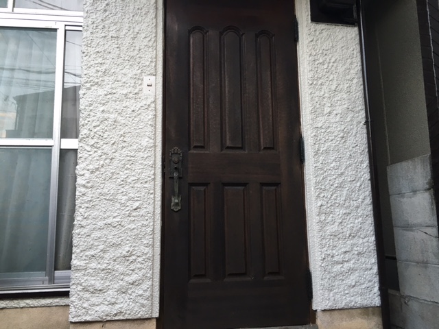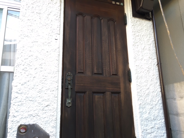 玄関扉の塗装です。木製の扉ですが、劣化が激しく、塗膜が捲れて色がかなり薄くなっていたので木部専用塗料のキシラデコールで塗装することにしました。まず1回目の塗装で塗料を馴染ませます。