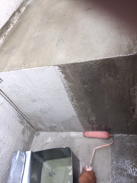 ベランダの防水です。下地をしっかり補修した後はプライマーという接着剤の役割を果たす塗料の塗装です。