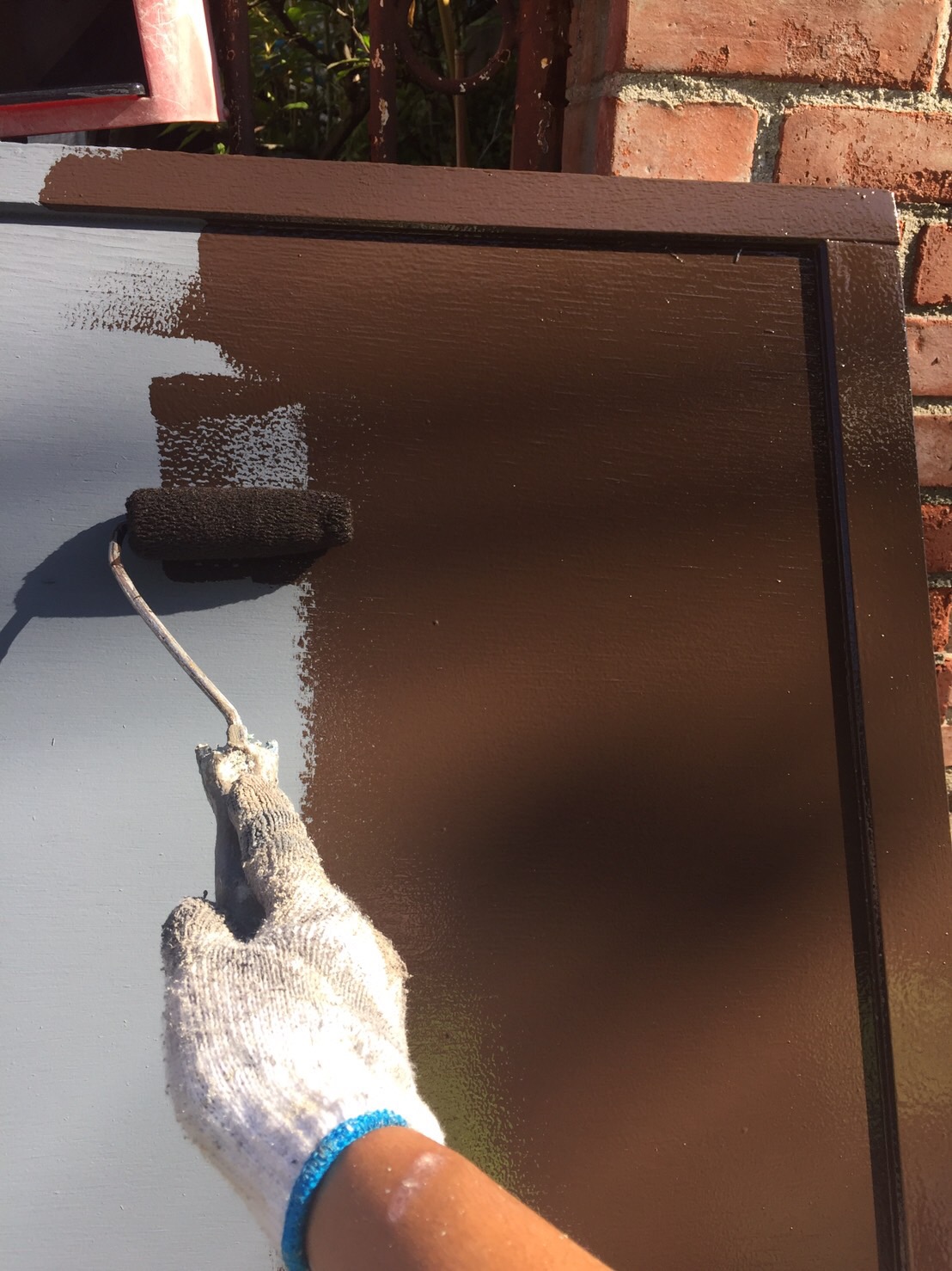 雨戸の塗装です。木製の雨戸ですが下地がかなり悪くそのまま塗装出来なかった為に一度下地を全て捲り新しくベニヤ板で補修しました。写真はそのベニヤ板の上から下塗りを塗装しているところです。