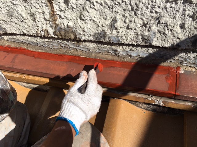 高圧洗浄後は鉄部の錆止めを塗装します。鉄部用ペンキの密着性を高めるために錆止めを塗装していますので耐用年数にかなり差が出てきますね。
