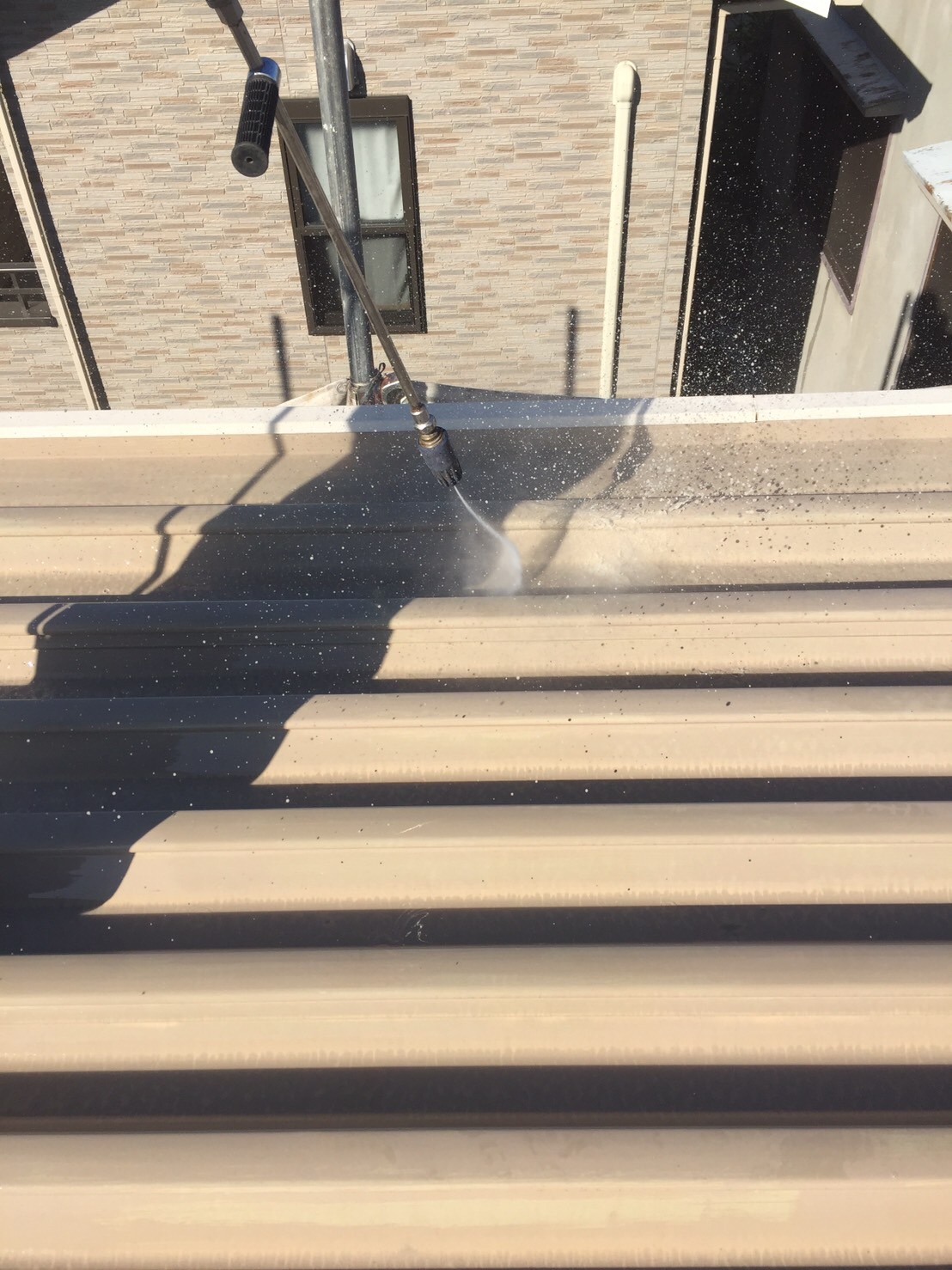 屋根の高圧洗浄です。汚れが一番付着している箇所でもあるのでかなり時間をかけて洗浄していきます。