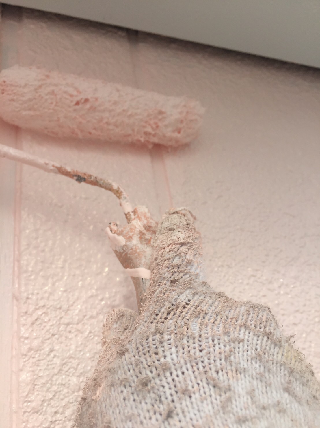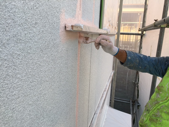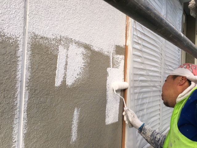 既存の外壁の状況はリシン吹き付けによる外壁でしたので今回はマスチックローラーによるなみがた仕上げになりました。下塗りの弾性フィラーをたっぷりと塗装していきます。