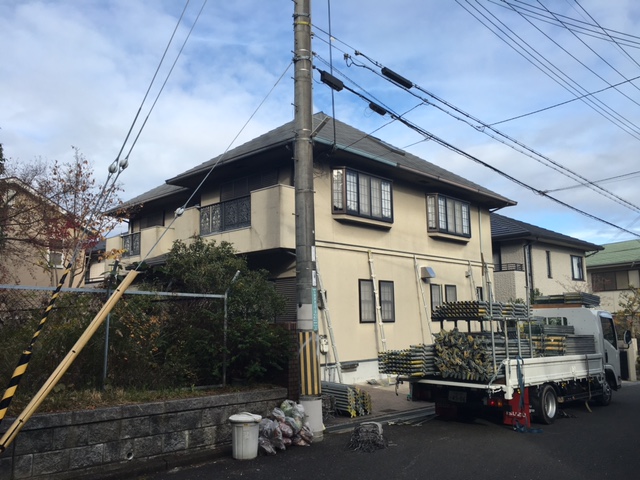 築18年の木造モルタル壁の2階建戸建です。足場面積は約300㎡となっており2階建にしては少し大きめの戸建になりますね。クラックや外壁の劣化などは特には見られないのですが18年間で1度も手入れをされていなかった為、屋根の状況なども気になるということで工事のご依頼を承りました。