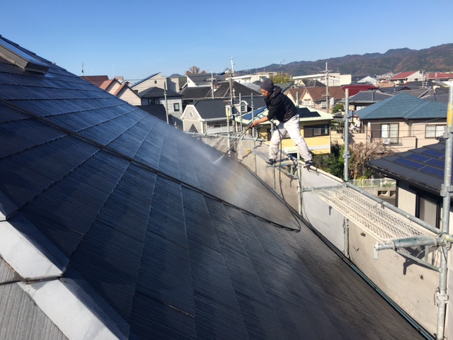 今回の現場の屋根は傾斜がかなりきつい為洗浄なども苦労しました。屋根は過酷な環境に晒されている為洗浄はきっちりしないといけないので時間をかなりかけて行いました。