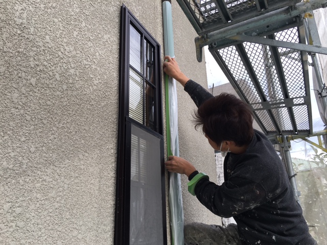 屋根の塗装作業後は外壁の塗装の準備です。窓サッシなどのペンキが付着してはいけない箇所に養生をしていく作業です。この養生作業をだいたい1日くらいかけて行っていきます。