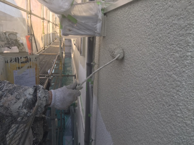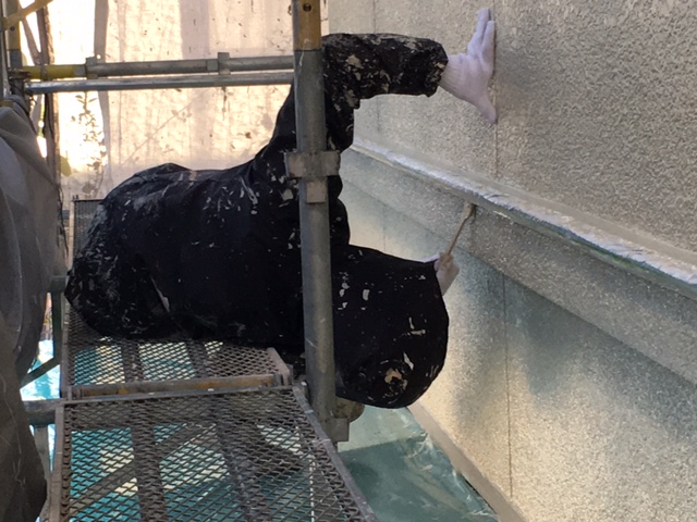 外壁下塗り後の中塗りです。今回の使用塗料は日本ペイントの水性パーフェクトトップで色番はND-218です。最近はこのパーフェクトトップを使用する機会が多くなってきましたね。値段もシリコンより少し高いくらいで耐用年数が18年も保つというこの塗料の良さがお客様にも気に入っていただける要因の一つになっています。