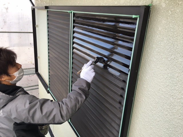 外壁塗装後は鉄部の塗装です。雨戸は錆止めを塗装後にペンキで仕上げます。ペンキの色によって錆止めの色を使い分けます。今回は茶色で雨戸を仕上げますので黒錆色の錆止めを使用しています。