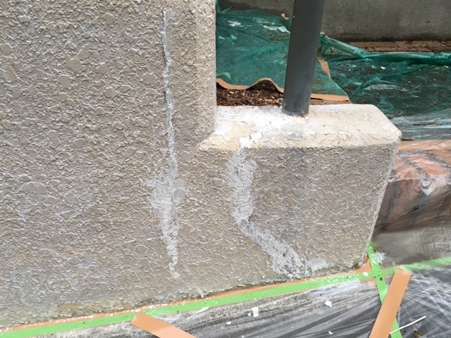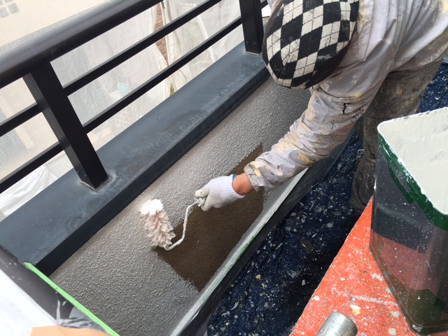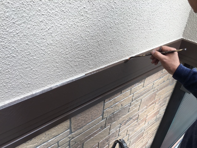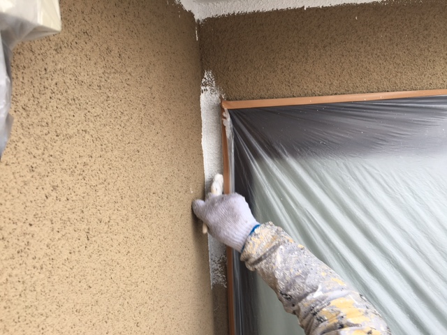 モルタル部分の下塗りです。ローラーで塗装しにくい所は刷毛で塗装します。見えなく、狭い所でも塗り残しがないように丁寧に仕上げます。