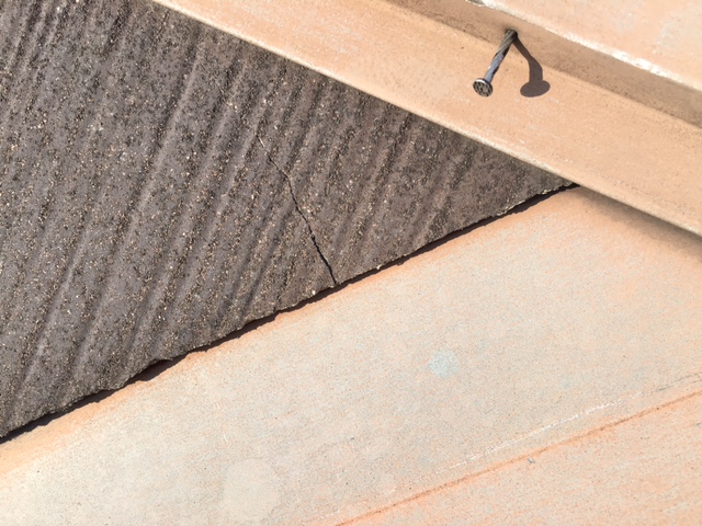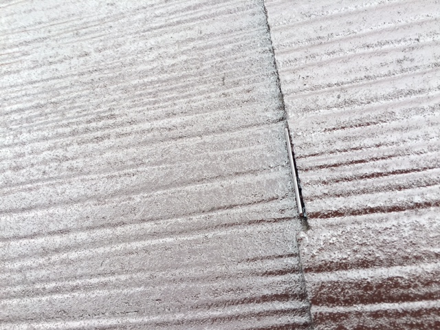 足場架設後は屋根の点検を先にします。15年も経過しているとあちこちに劣化が見られますね。写真は屋根の雨押えの鉄板ですが、釘で打ちこんでいるのですが、その釘が前に出てきてしまい隙間が開いている状況ですね。雨漏りの原因になります。