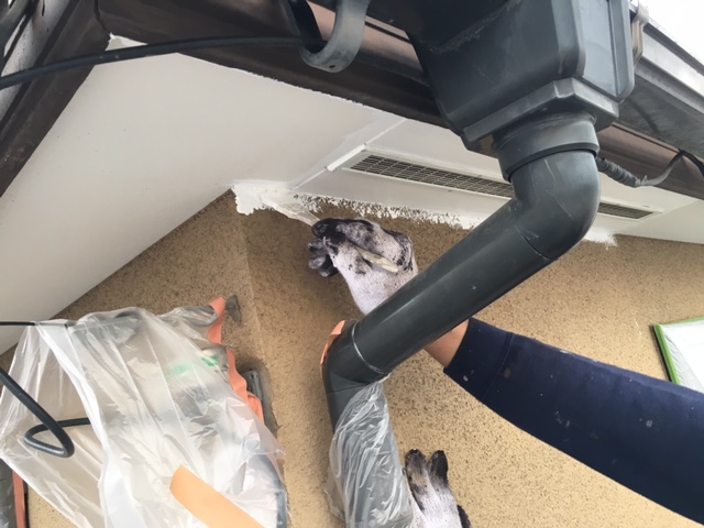 上から順番に仕上げていきます。まずは軒天の塗装です。ボードタイプの軒天なので通気性のある水性ケンエースで仕上げました。現状と同じ白色で仕上げたので汚れていた部分もなくなり綺麗に仕上がっています