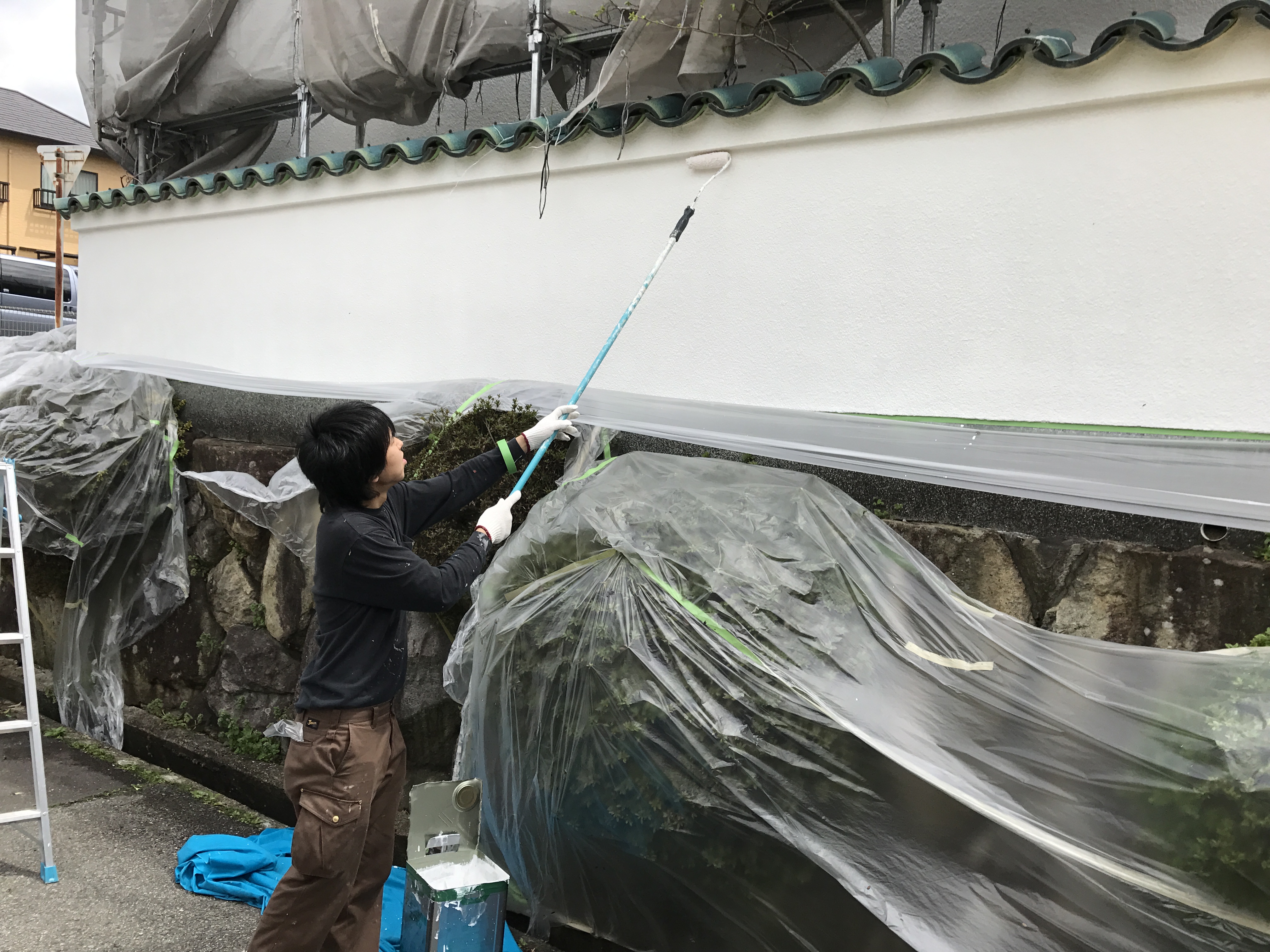 このように塀の届きにくい部分は長い棒の先にローラーをつけて塗装していきます。