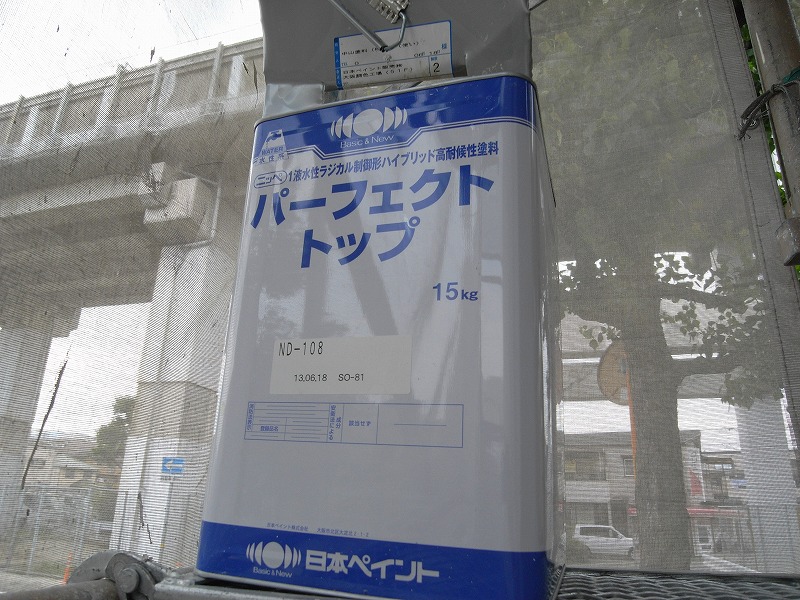 外壁は日本ペイントの新型塗料「パーフェクトフィラー」と「パーフェクトトップ」で塗り替えました。 パーフェクトトップは紫外線による劣化を防ぐ新技術で、従来のシリコン塗料をしのぐ耐久性を備えています。 表面のキメが細かくつややかに仕上がります。