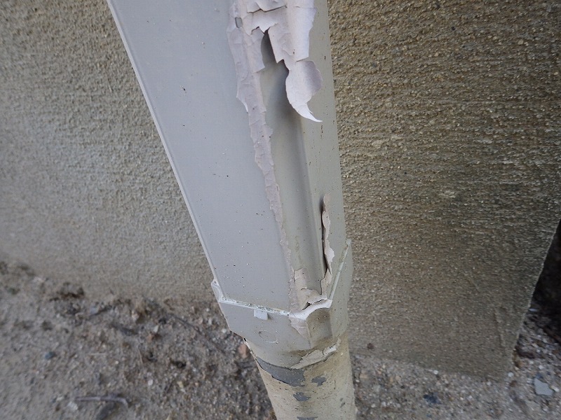 前回塗られた雨どい。 塗装が盛大に剥離しています。塩ビ製の雨といはきれいなら塗らない場合もありますが、こうなってしまっては塗るしかありません。できるだけ塗膜を落とします。 電動工具では雨樋に穴が開くので手作業になります。 他にも、通常は塗らないアルミの部材(手すりなど)まで塗装されているので塗装が劣化して汚れてしまってます。 これも再塗装するしかありません。