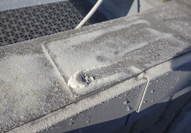 洗浄後、周辺には塗装に含まれていた砂(珪砂)が見られます。 足場架設後に建物全面を点検した結果、当初予定の下塗り材では不具合の恐れがある為、別の材料に変更いたしました。