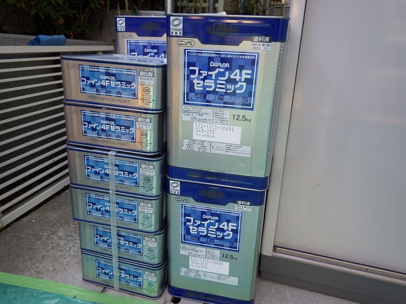今回使用したフッ素樹脂塗料。日本ペイントの最高級塗料「ファイン4Fセラミック」です。 二液タイプの弱溶剤塗料(シンナー臭があります)。