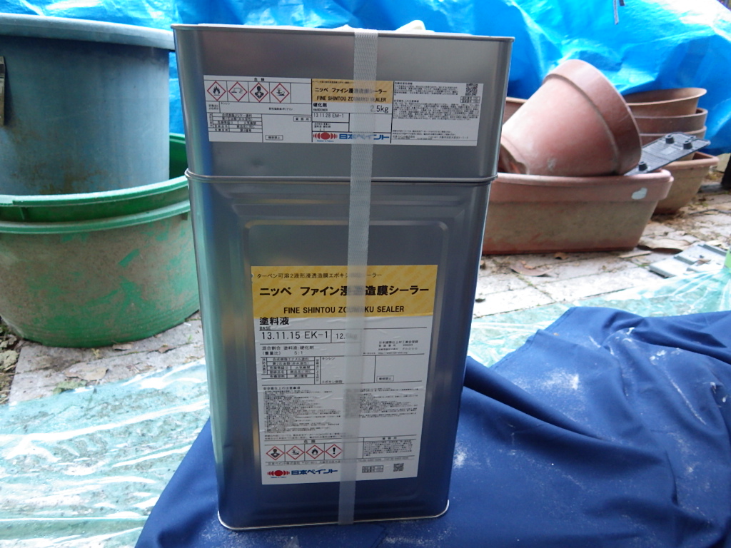 下塗り材。 想定より旧塗膜が脆弱で、塗料の吸い込みが激しいと思われました。 下地に浸透して固定化し、上塗り材の吸い込みを抑える二液タイプの造膜シーラーを使用。使用量も想定を超えました。